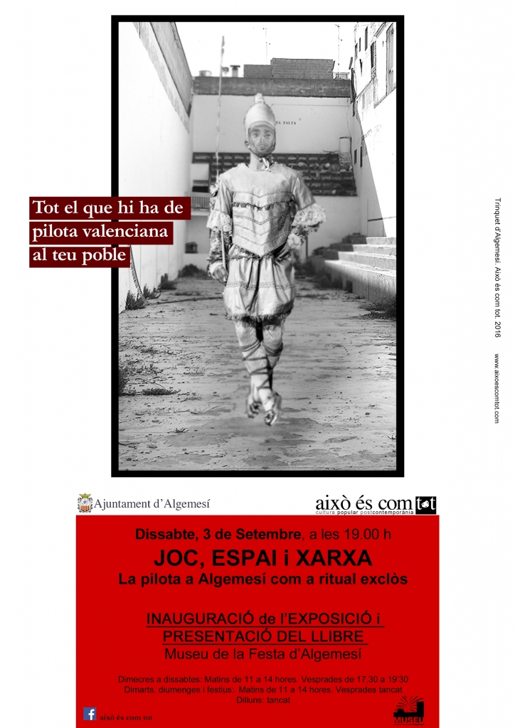 Al claustre del Museu de la Festa d’Algemesí el dissabte 3 de setembre i a partir de les 19 hores, presentarem el llibre i l’exposició de la història de les nostres reflexions sobre la pilota valenciana a Algemesí, Joc, espai i xarxa. “La pilota a Algemesí com a ritual exclòs”.